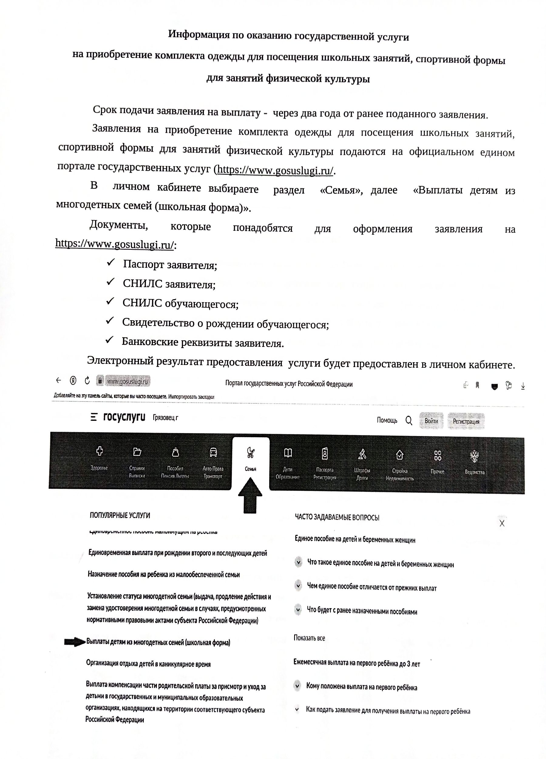 Заявление на приобретение комплекта одежды для посещения школьных занятий, спортивной формы для занятий физической культуры подаются на официальном едином портале государственных услуг https://www.gosuslugi.ru/.