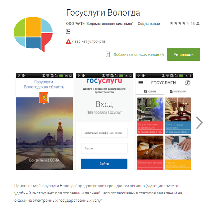 Мобильное приложение «Госуслуги Вологда» можно скачать в Google Play https://play.google.com/store/apps/details?id=ru.it.m.. Приложение разработано для устройств с операционной системой Android 1.6 или более поздних версий
