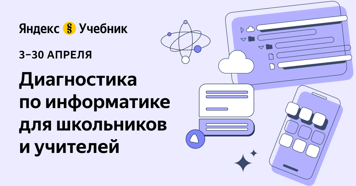 Диагностика для учителей Яндекс Учебник предлагает преподавателям информатики пройти диагностику, которая поможет им определить, как изменились их профессиональные компетенции за этот период, и при необходимости скорректировать свою траекторию развития. Учителям предстоит проверить свой уровень цифровой грамотности и навыки программирования, а также насколько хорошо они знакомы с ФГОС. Время прохождения диагностики — 40-45 минут. Исходя из результатов, преподаватели смогут выбрать подходящие курсы повышения квалификации, чтобы повысить свои компетенции. Как пройти диагностику для учителей: Зарегистрироваться на сайте https://education.yandex.ru/inf как учитель (если учитель не был зарегистрирован ранее). Перейти во вкладку «КПК» и открыть курс «Диагностика по информатике». Диагностика для учеников Диагностика по информатике рассчитана на учащихся 5-11-х классов и включает задания по трём темам: Цифровая грамотность. Позволяет узнать, насколько школьник продвинулся в освоении базовых цифровых инструментов, программных сервисов, а также основ цифровой безопасности. Основы информатики по ФГОС. Проверяет, обладает ли ученик всеми навыками, рекомендованными федеральными стандартами, в соответствии с его возрастом. Программирование. Определяет уровень освоения кодирования в старших классах и выявляет склонности к программированию у школьников, которые только начинают его изучение. Задания диагностики объединяет общий сюжет, по которому дети оказываются в конкретных жизненных ситуациях. Они учатся самостоятельно делать выбор, применяя полученные знания на практике. Ученикам предстоит проявить знание основ кибербезопасности и цифрового этикета, навыки планирования, поиска в интернете, подготовки презентаций и работы в редакторах. Выполнение диагностики займет 40-45 минут. Её можно провести на уроке или задать на дом. Как организовать прохождение диагностики учеников: Зарегистрироваться на сайте https://education.yandex.ru/inf как учитель, создать класс, добавить учеников (если учитель не был зарегистрирован ранее). Ученики автоматически получат доступ к диагностике в своём личном кабинете. Диагностика будет доступна как отдельный предмет «Информатика + Я = ?», начиная с 3 апреля. Раздать ученикам логины и пароли, предложить им пройти задания.